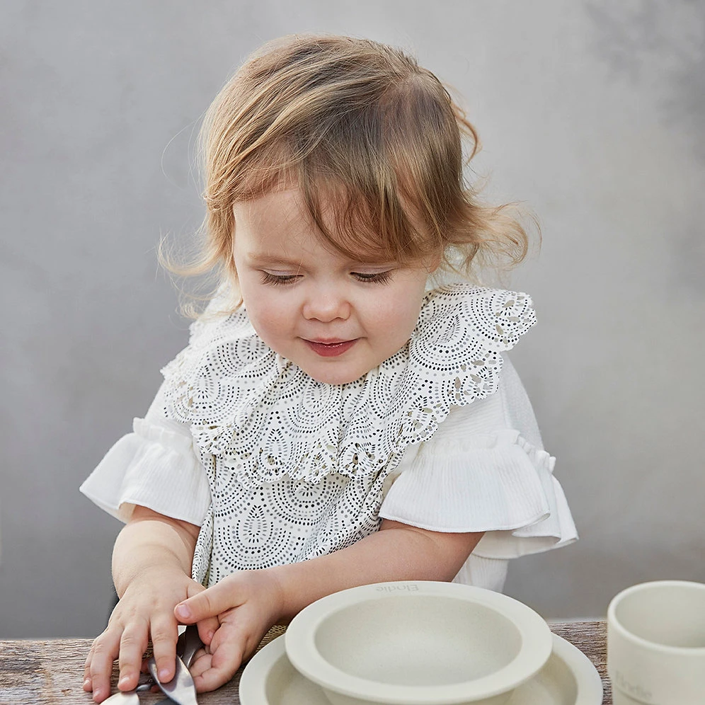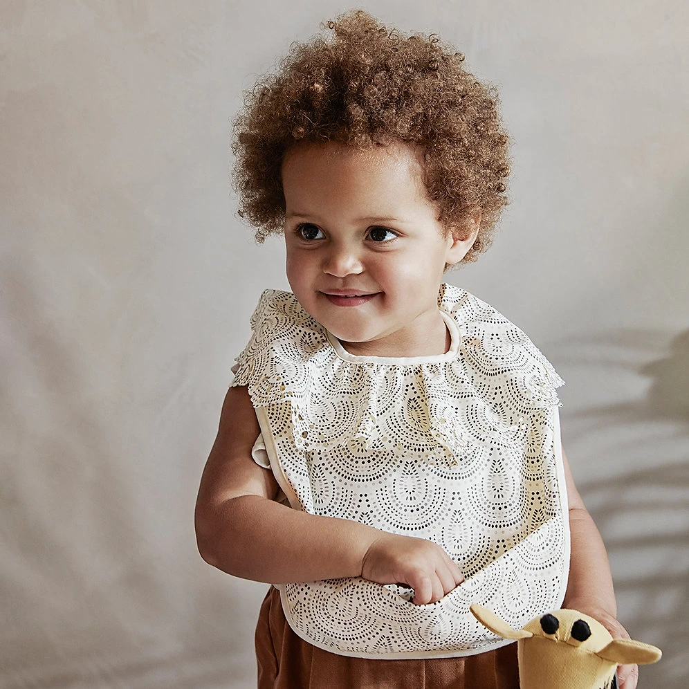 La coupe large du bavoir couvre les épaules et la poitrine, et la poche souple attrape la nourriture et les petites miettes, pratique pour ne plus en avoir partout. Il s’attache facilement à l’arrière du cou à l’aide d’un velcro large et tout doux. Votre petit aura du style pendant ces repas.