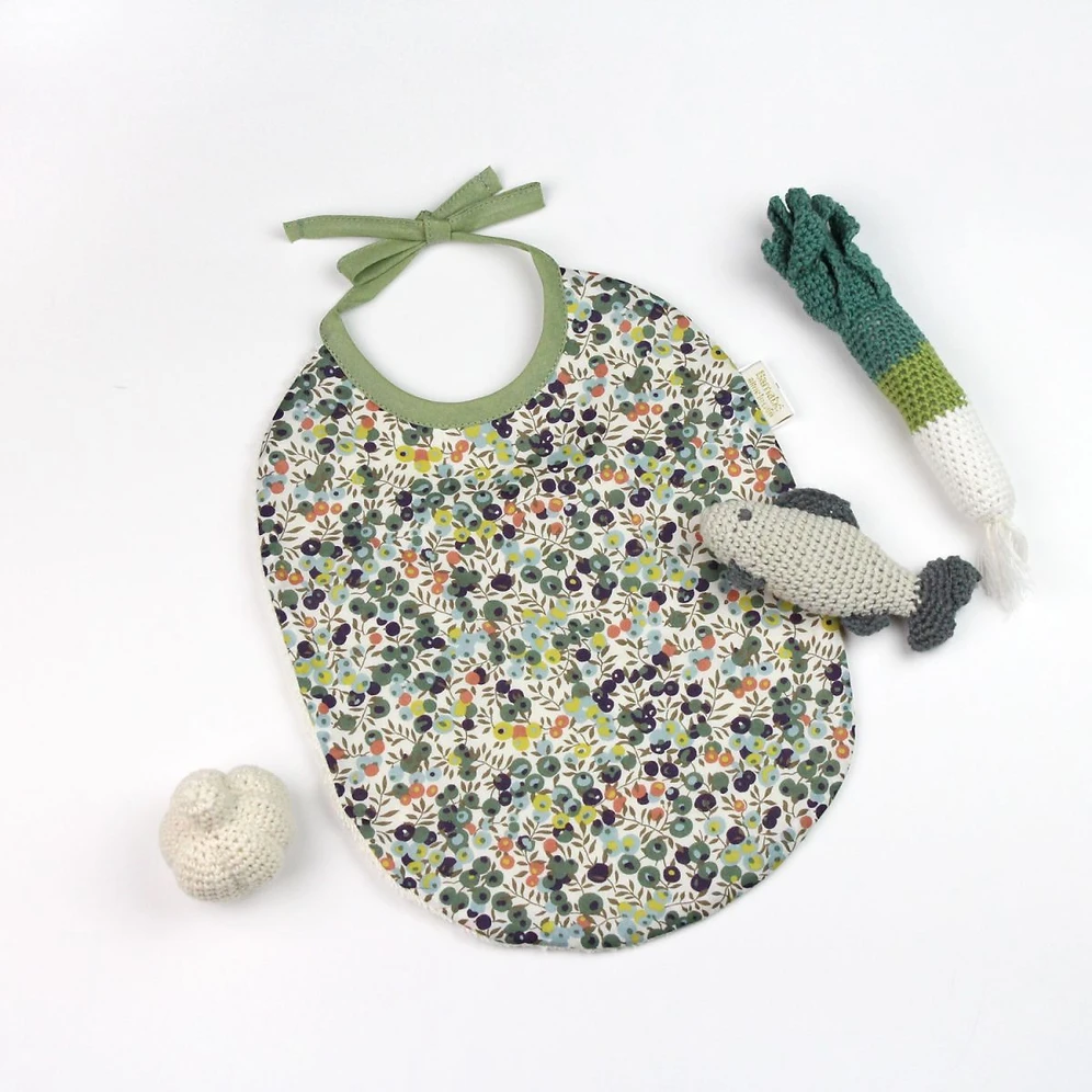 Un coté en éponge pour éviter toutes les catastrophes et un coté en joli tissu Liberty… Ce grand bavoir aux couleurs éclatantes fera un très joli cadeau de naissance !