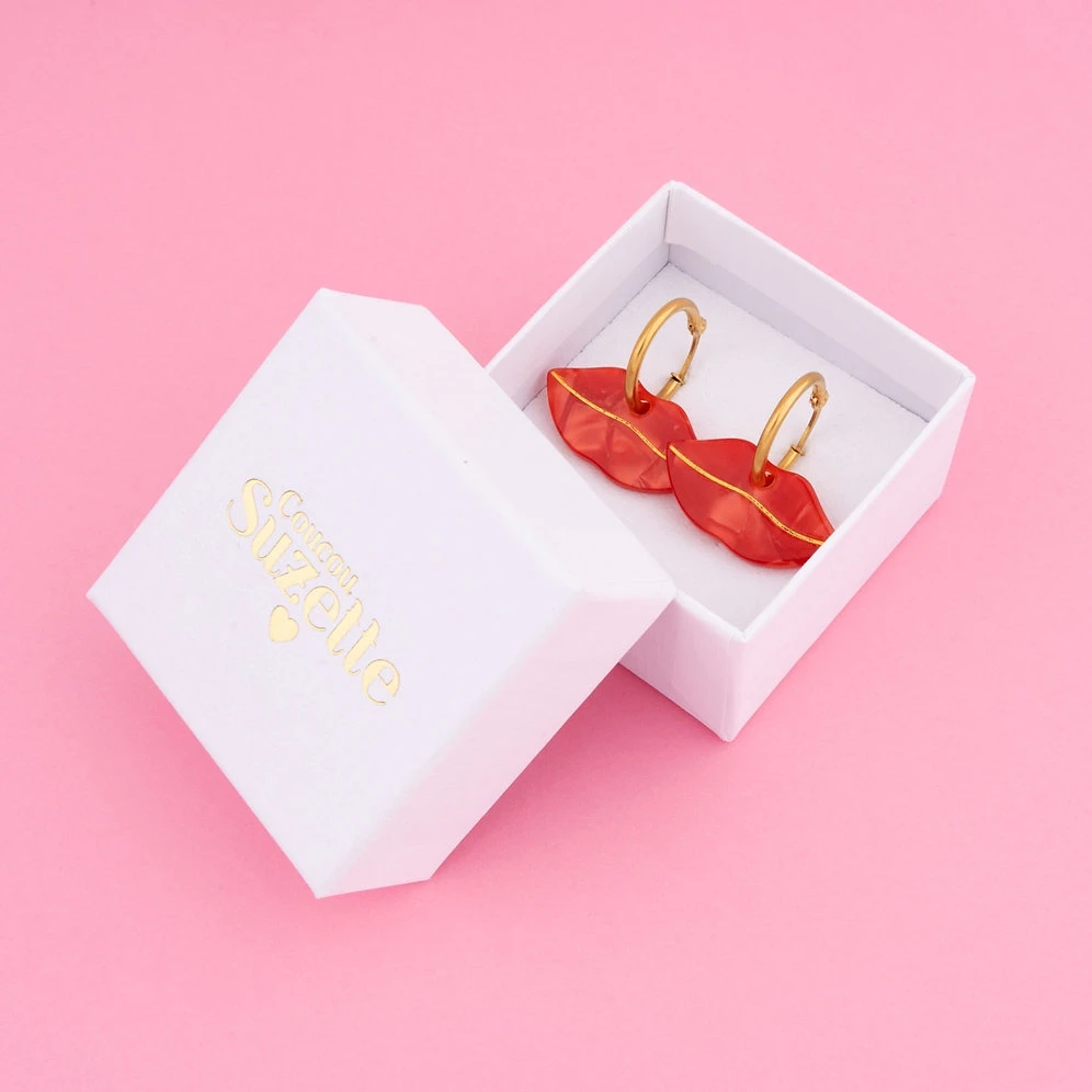 Glamour et sensuelle cette paire de boucle d’oreille de la marque kitsch et rétro Coucou Suzette est une invitation au baiser.