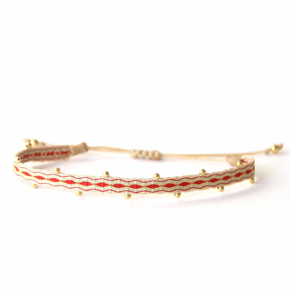 Bracelet orné de perles en or et tissés de rouge, de beige, de vert pistache et d’un fil métalisé doré. Ce bracelet est 100% fait à la main.