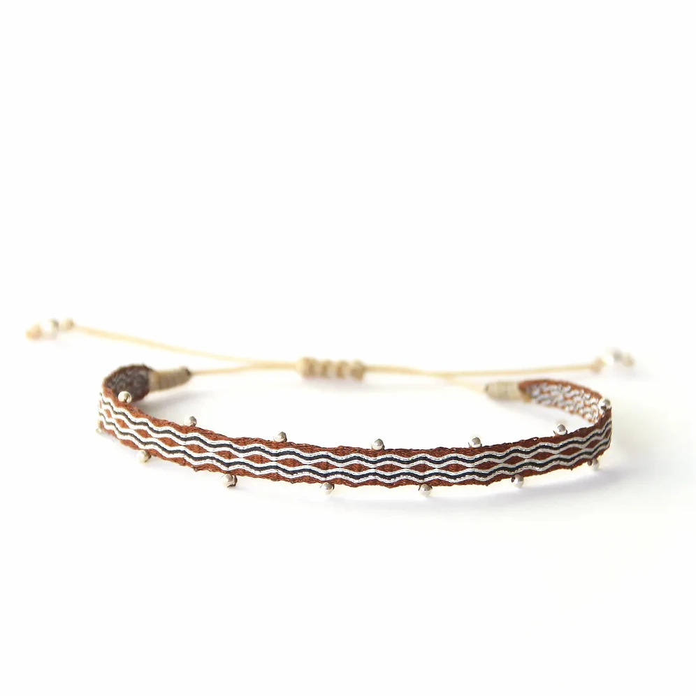 Bracelet orné de perles en argent et tissés de marron, de noir et de blanc avec un fil métalisé argenté. Ce bracelet est 100% fait à la main.