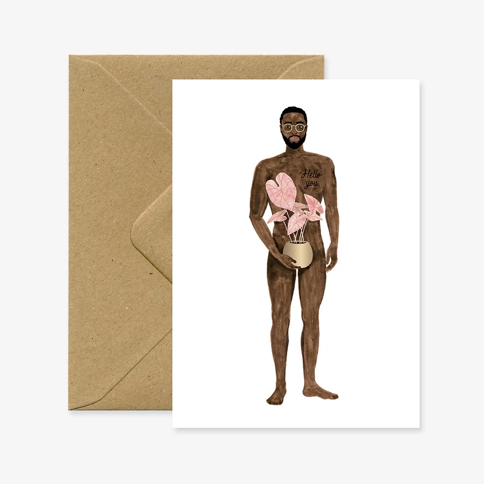 Voici la carte imaginée par la marque française All The Ways To Say. Elle représente un homme nu portant une plante. Il est accompagné d’une inscription sur le torse « hello you »… Une carte rigolote pour écrire un message.