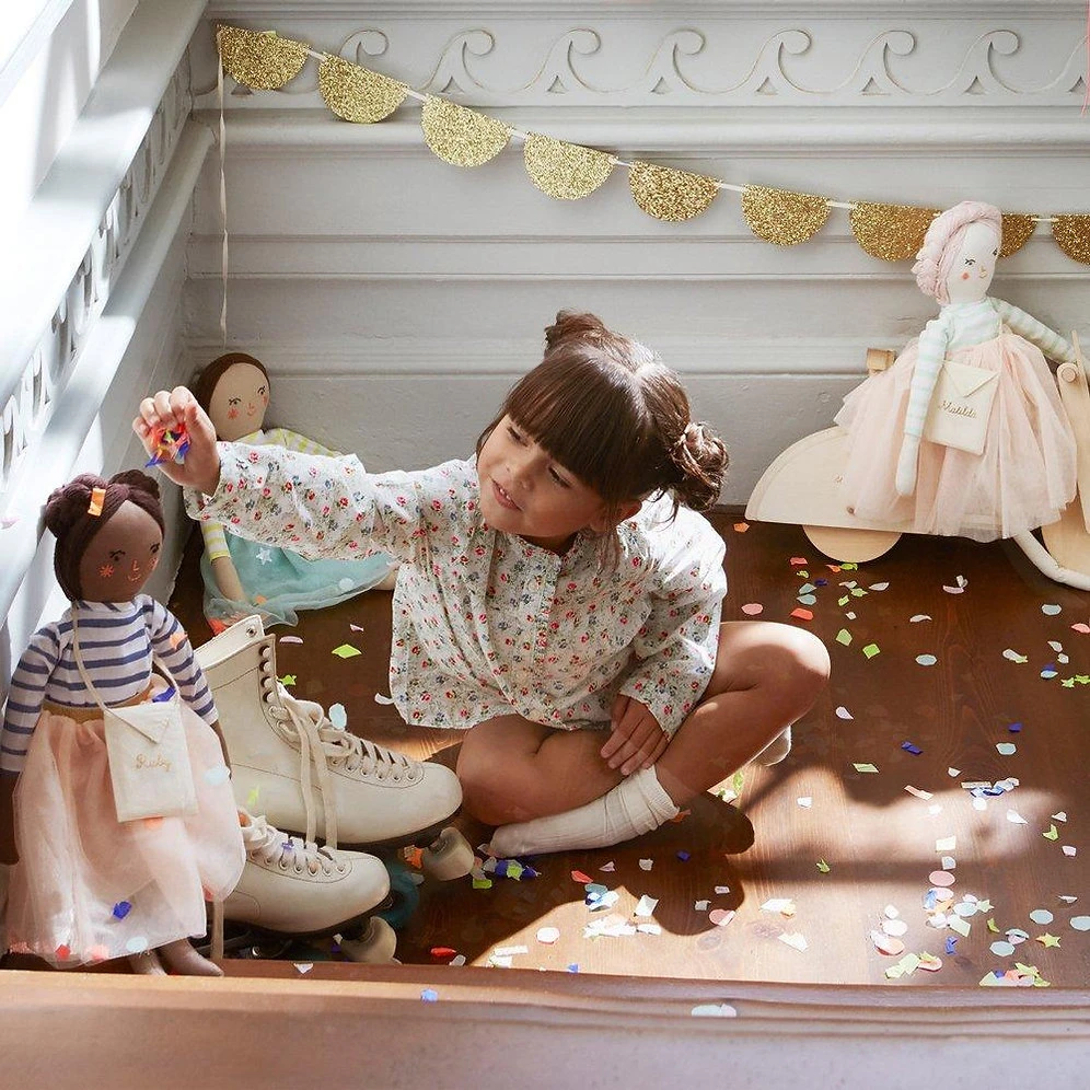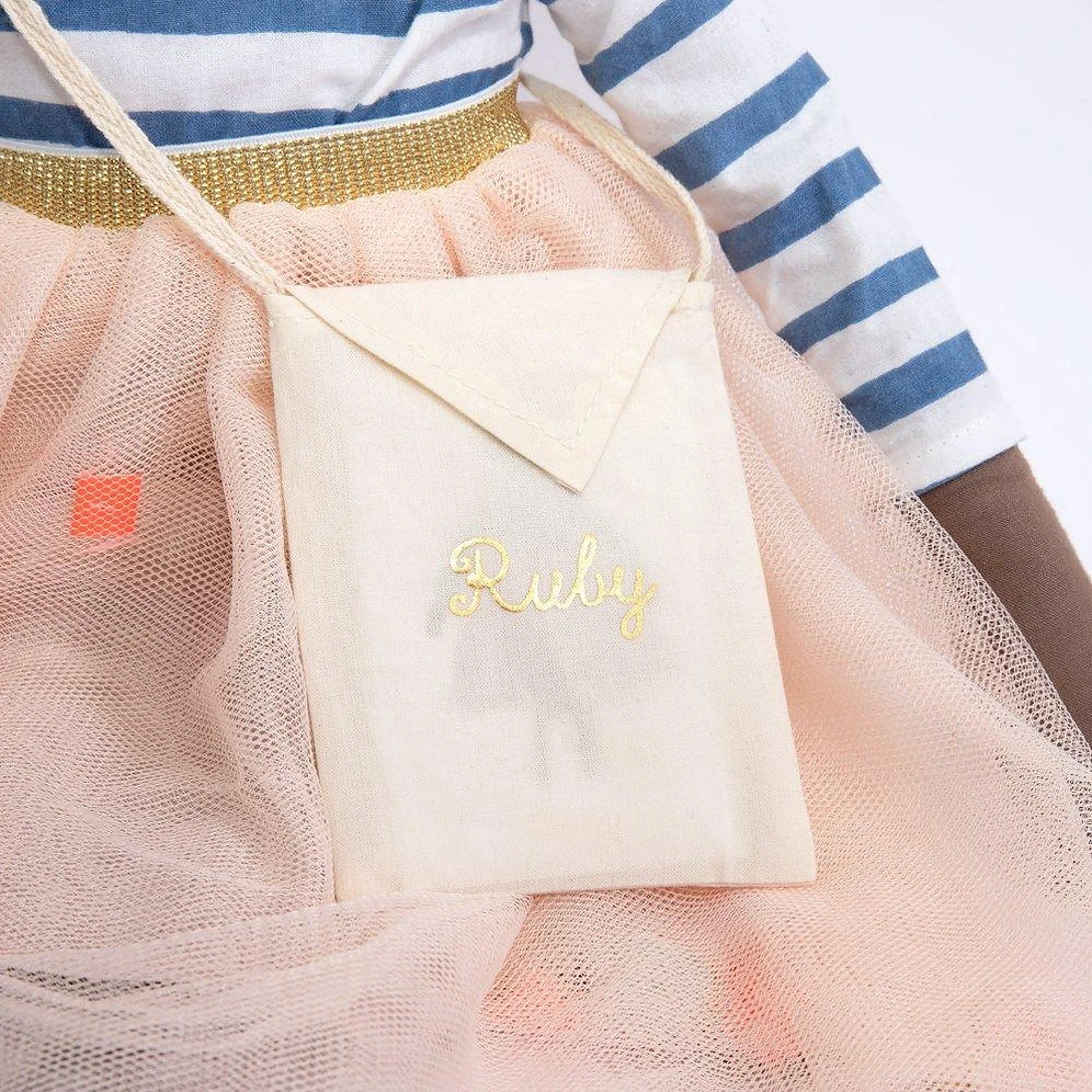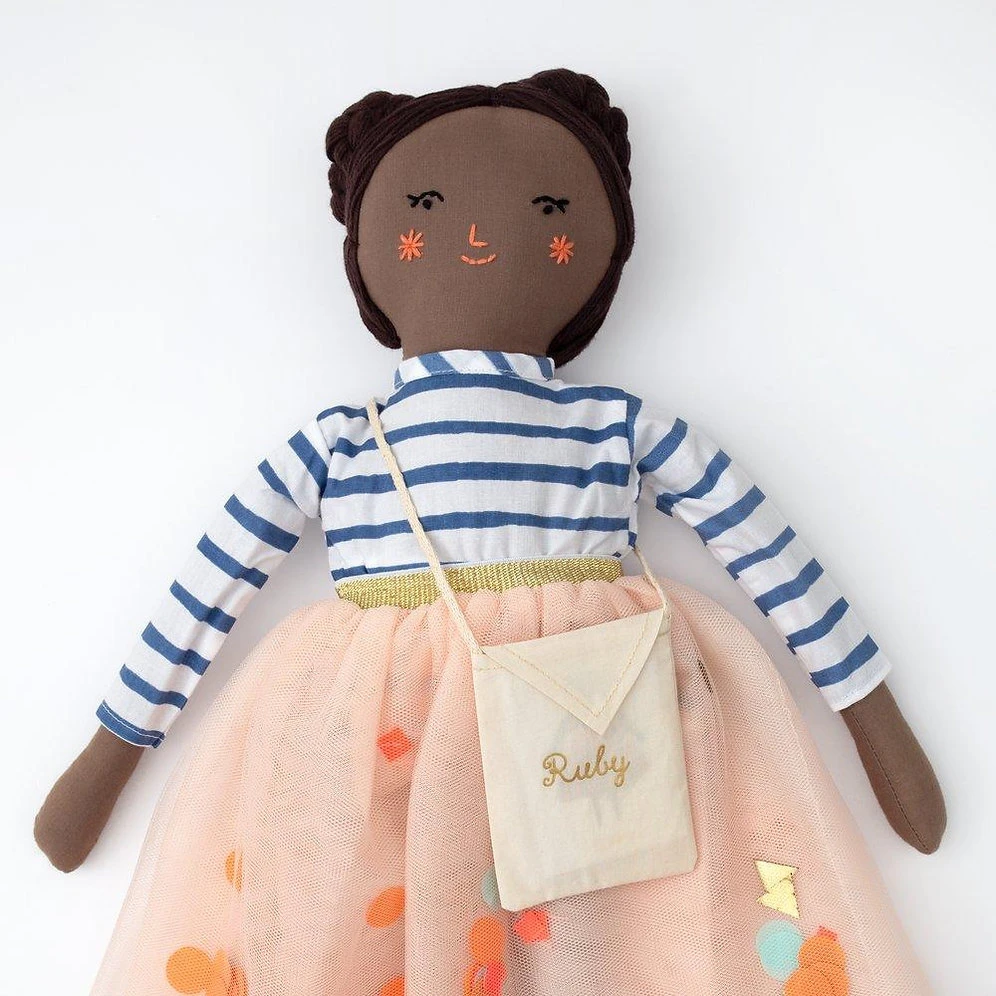 La poupée Ruby est très élégante, les enfants voudront s’amuser avec elle et même lui faire des câlins. Avec sa chemise à rayures bleues, sa jupe tutu à sequins roses et ses cheveux en laine noire tressés , votre enfant pourra rêver et voyager avec cette poupée.